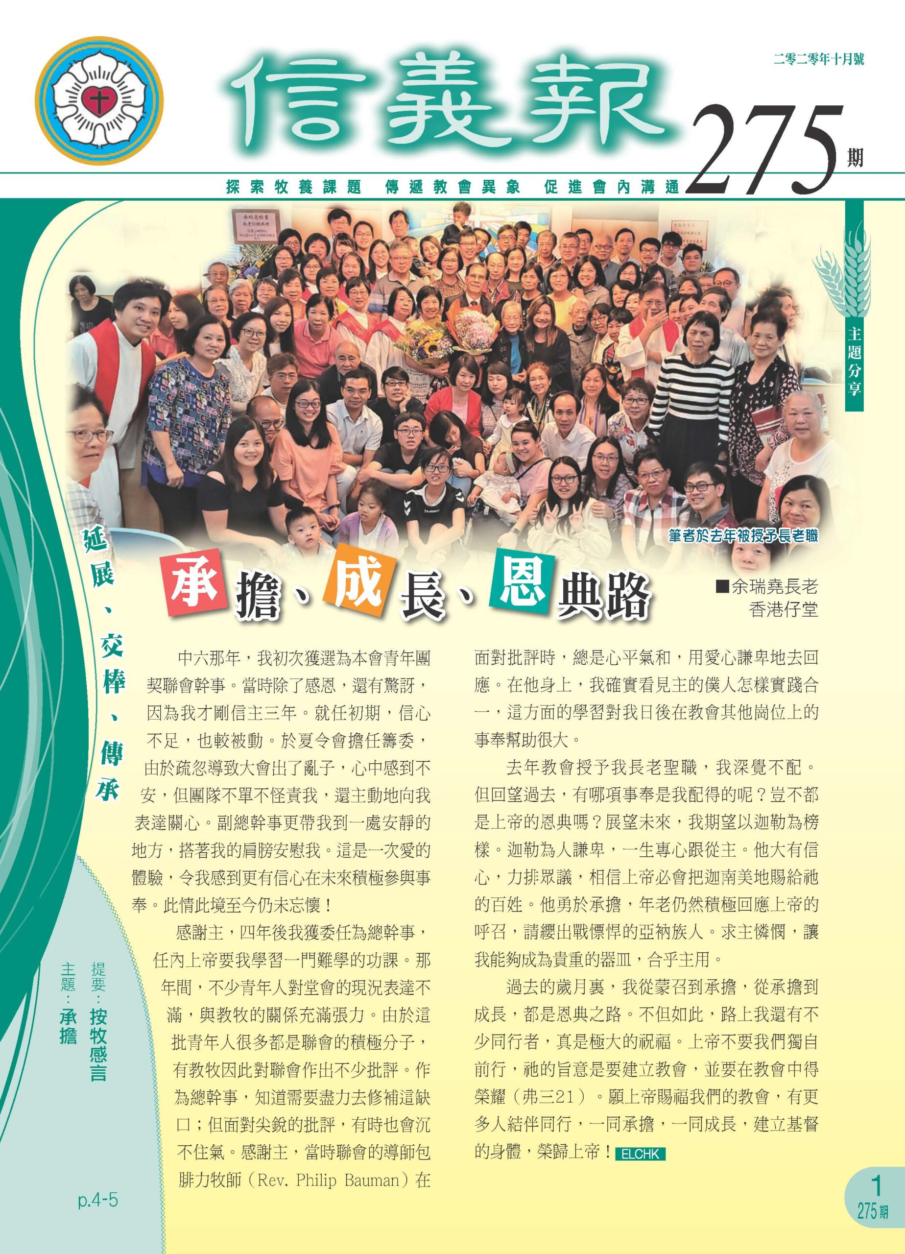 275期信義報(2020年10月) 主題:承擔 Elchk Lu-news2022-09-30T09:12:14+08:00 275期信義報(2020年10月) 主題:承擔 主題分享:承擔、成長、恩典路(余瑞堯長老) 年輕信徒對牧者的期望(何紀樺姊妹) 信義百年:芬蘭差會在華事工點滴(呂慶棠牧師) 按牧感言:按牧感言(巫若燕牧師、徐展明牧師、黃志東牧師、鄭義森牧師、陳穎嫻牧師) 差傳呼聲:承擔(黃志輝牧師) 心靈綠洲:抗逆能力 助我承擔所處崗位的責任(張頴思博士) 看見需要:鄉郊長者的人‧情‧事(陳曉盈,社會服務部) 信義脈搏 監督的話:身心靈健壯(張振華監督) 踏入新屆度276期信義報(2020年11月) 新形態下的生活274期信義報(2020年9月)