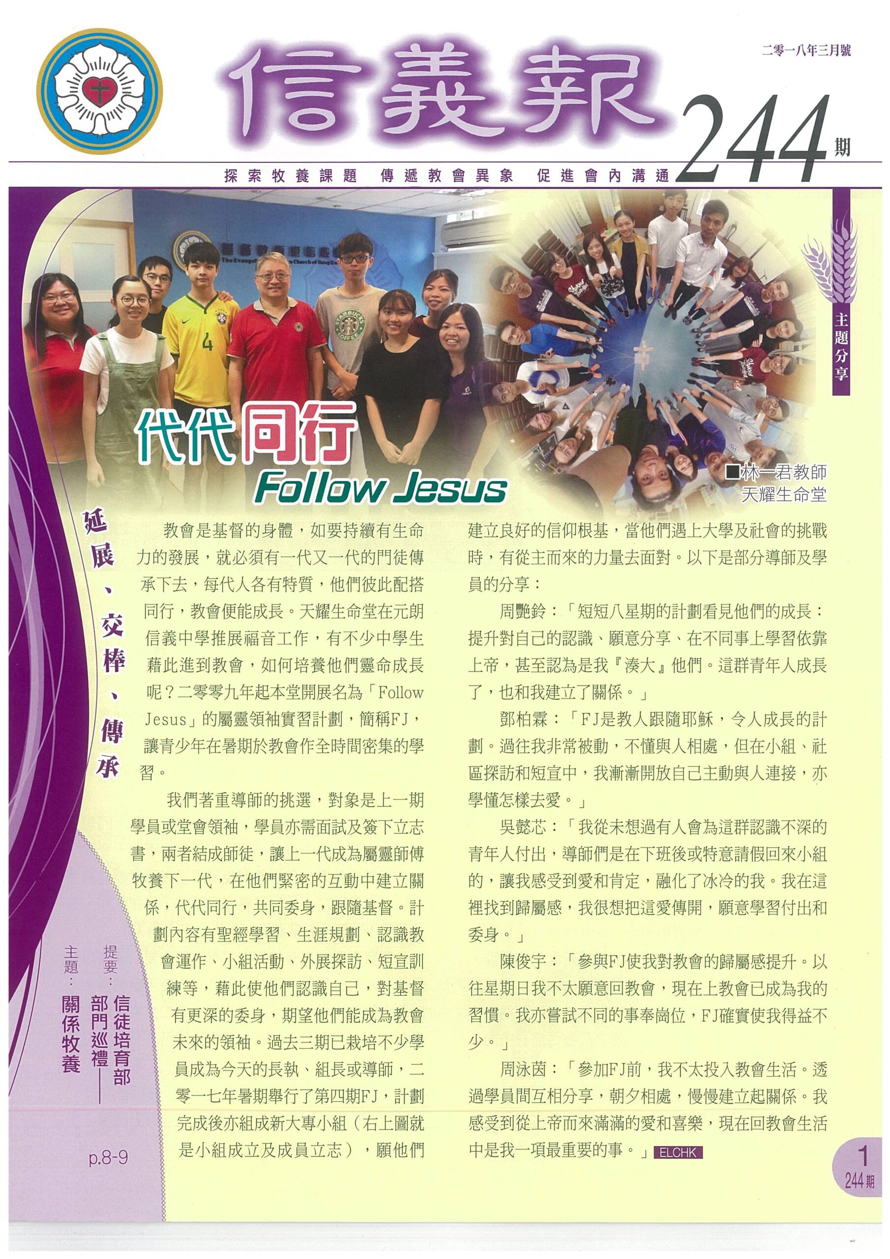244期信義報(2018年3月號) 主題:關係牧養 Elchk Lu-news2022-09-30T09:09:15+08:00 244期信義報(2018年3月號) 主題:關係牧養 主題文章: 1. 代代同行Follow Jesus(林一君教師) 2. 談兩代執事(楊兆竣弟兄) 3. 跨代祖孫情(彭衛慶先生) 4. 家長教育分享(蕭偉樂校長) 社會服務部人物專訪:「智愛。傳承」樂此不倦 差傳呼聲:差傳呼聲差會是教會的負累?負擔?得益秘笈!(上) 部門巡禮:信徒培育部 信義脈搏 監督的話:盡公民責任 三月十一日齊投票(張振華監督) 進入社區245期信義報(2018年4月號) 價值塑造243期信義報(2018年2月號)