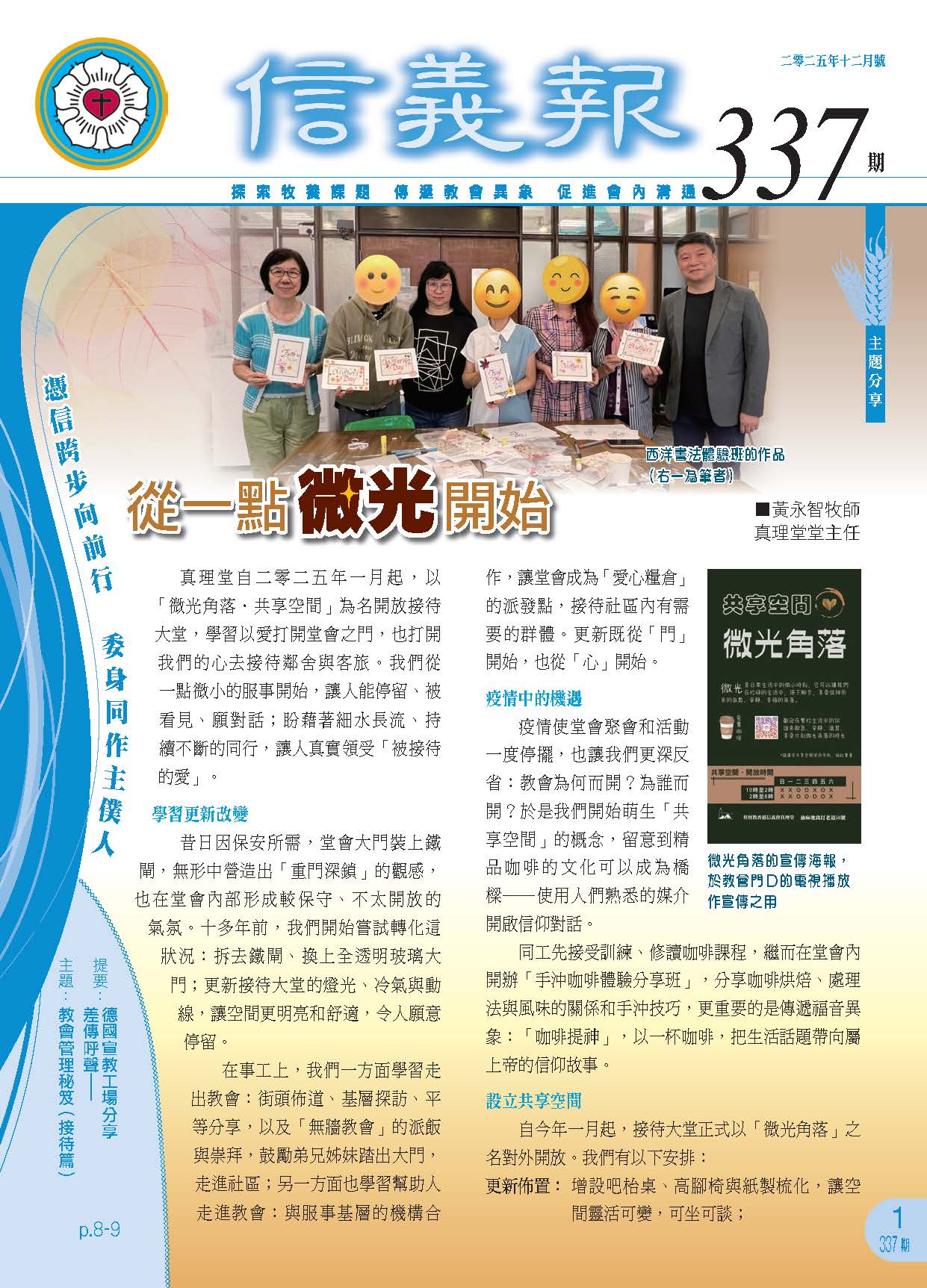 337信義報(2025年12月) 主題:教會管理秘笈(接待篇) ELCHK Super User2025-11-28T09:45:53+08:00 337信義報(2025年12月) 主題:教會管理秘笈(接待篇) 主題分享: 從一點微光開始(黃永智牧師) 不分你我的接待(藍新港牧師) 輪椅的接待(簡兆榮弟兄) 看見需要:在安寧的微光中與院友同行(陸偉民副院長) 校園快訊: 駕馭科技,AI與愛(尹浩然校長) 虛空與充滿(戴浩輝牧師) 差傳呼聲:德國宣教工場分享(陳永安牧師伉儷及段思奇姊妹) 信義脈搏 監督的話:接待:在教會中展現基督的愛(楊有志監督) 融合前行336信義報(2025年11月)