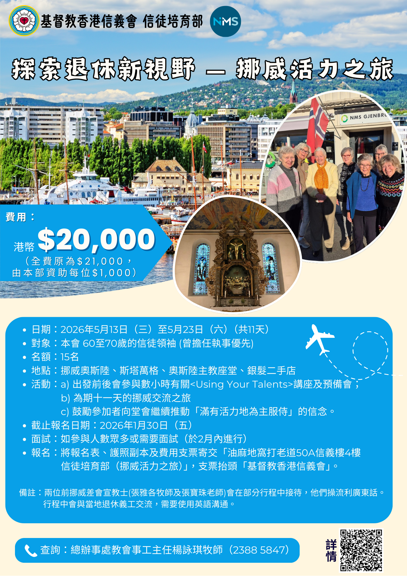 探索退休新視野 — 挪威活力之旅 ELCHK Super User2025-12-15T17:08:36+08:00 探索退休新視野 — 挪威活力之旅計劃_會函 探索退休新視野 — 挪威活力之旅計劃_海報 2026《信.異.行》青年領袖培育計劃招募成員