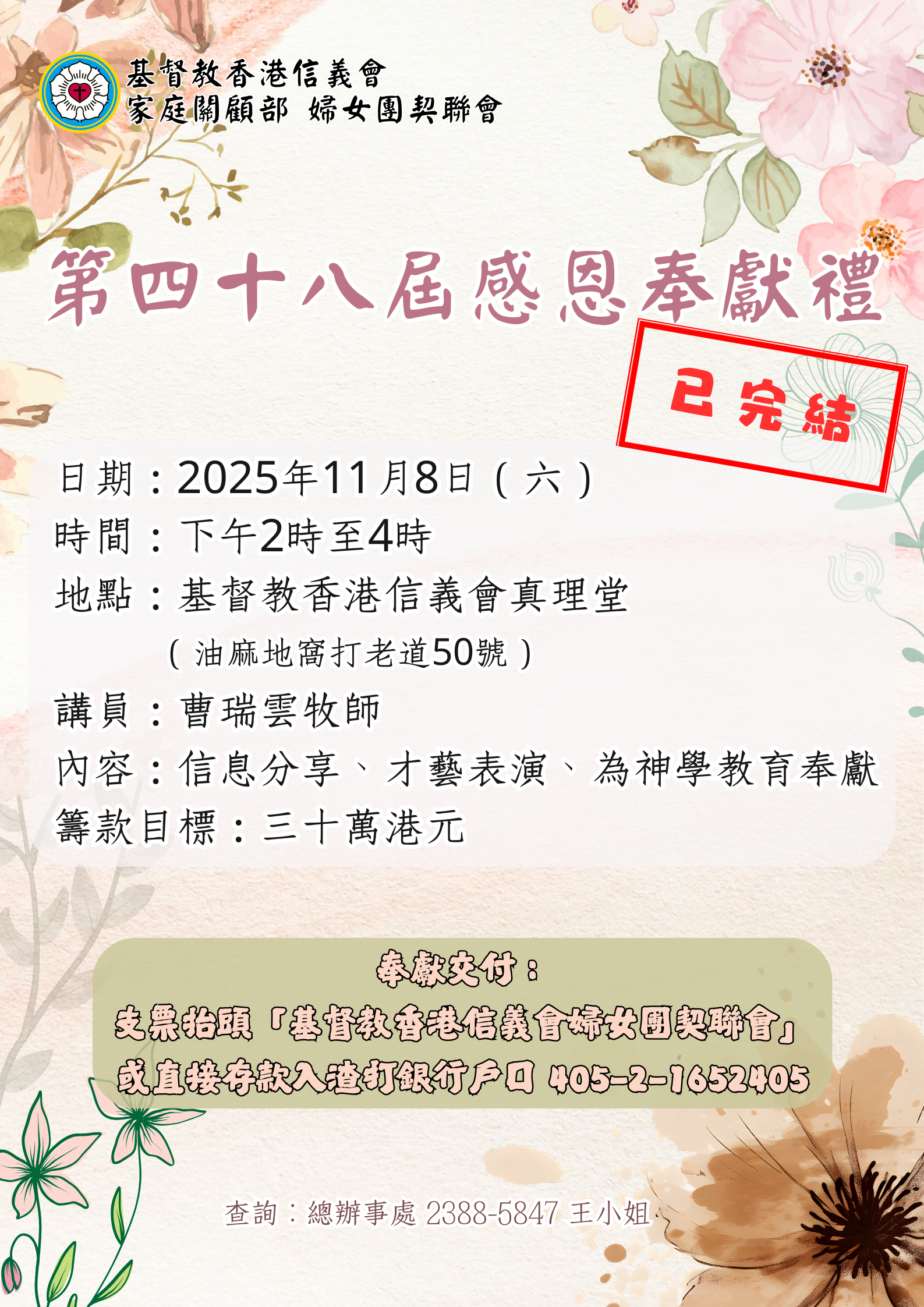 (已完結)婦女團契聯會第四十八屆感恩奉獻禮 ELCHK Super User2025-12-04T12:19:32+08:00 2025奉獻表格及奉獻分配表 2025感恩奉獻禮_信函 2025感恩奉獻禮_海報 (已完結)2025年聲樂訓練初階班 (已完結)裝備實踐,作好管家──2025受託講座